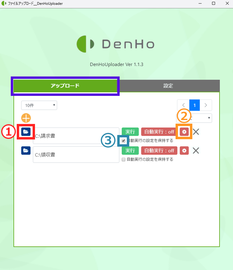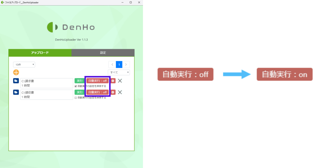 自動実行の設定を保持するにチェックを入れない場合、自動実行はOSの再起動、またはDenHo Uploader PCアプリを再起動した場合は自動的にOFFになります。再起動時はご注意ください。