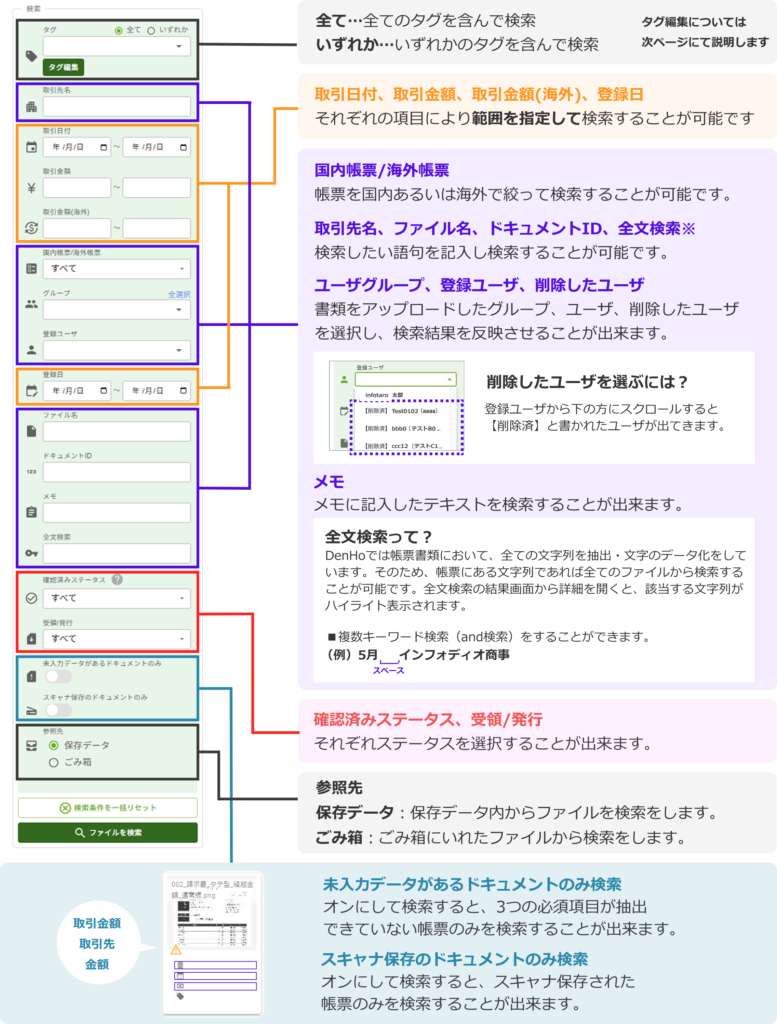 書類の検索をする時には、以下項目で条件をしぼったりキーワードを入れて検索することが可能です。