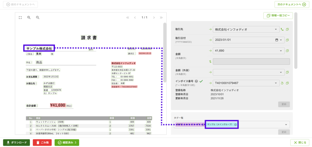 設定後にドキュメントをアップロードすると、帳票内のすべての文字の中に設定したキーワードと一致する文字列があった場合に、自動でタグが付与されます。
